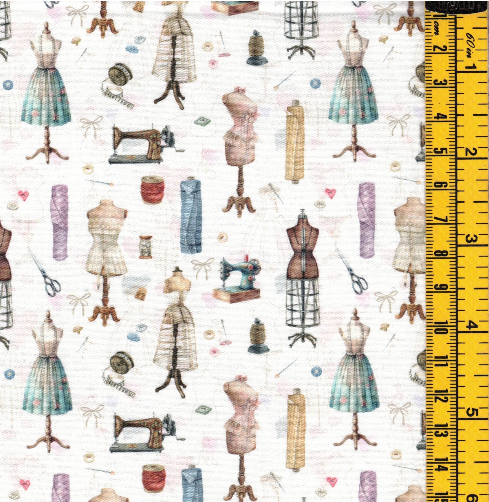 100% Bavlněná látka s potiskem - šicí motiv. Vhodná na patchwork, kabelky, šití oděvů, bytových dekorací a doplňků.