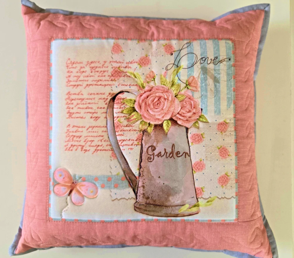 Povlak na polštářek vel. 42 x 42 cm ušitý technikou patchwork V kombinaci panel a starorůžová lněná půda. Zadní strana polštářku je starorůžová s aplikací srdíčko s uzávěrem. Olemován je šedou paspulkou. Prošitý ozdobným stehem.